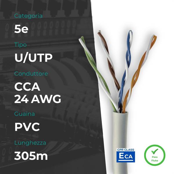 Matassa U/UTP Cat5e da 305 metri con conduttori in CCA (Copper Clad Aluminum), ideale per la realizzazione di reti Ethernet fino a 1000 Mbps (Gigabit Ethernet). La guaina in PVC e la sezione del conduttore 24 AWG la rendono adatta ad installazioni in ambienti interni. Conforme alla classe CPR ECA per la sicurezza in caso di incendio.
