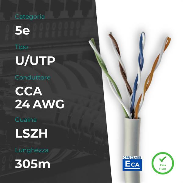 Cavo di rete U/UTP Categoria 5e con conduttori in rame pieno (CU) da 24 AWG, lungo 305 metri, ideale per applicazioni di rete Ethernet, Fast Ethernet e telefonia. La guaina esterna in materiale LSZH (Low Smoke Zero Halogen) garantisce bassa emissione di fumo e assenza di gas tossici, rendendolo idoneo anche per ambienti pubblici e ad alta affluenza. Classificato ECA secondo la normativa CPR per la reazione al fuoco.